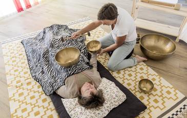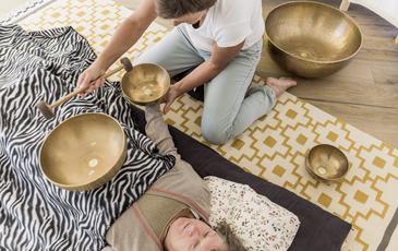 Bei dieser entspannenden und beruhigenden Massage werde die Klangschalen direkt auf den bekleideten Körper aufgelegt oder darüber gehalten.
